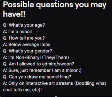 Can I admire you?: Yes! However, keep in mind that I am a minor! Please refrain from anything that may be NSFW! (See questions FAQ below).